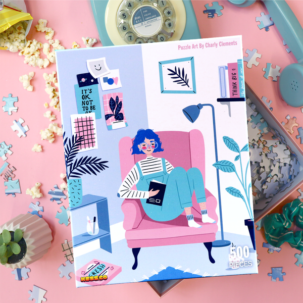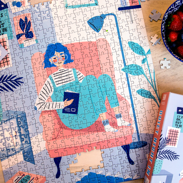 Quiet Night In 500 Piece Puzzle features the tranquility of a quiet night at home getting lost in a book by UK illustrator Charly Clements. De.bored puzzles brings you artist-inspired puzzles. These frame-worthy designs will help you unplug and destress allowing you to de.bored your life! Puzzles are packaged in matte-finish colorful designs and meant to dress up your shelf. Pieces have back coating and minimal dusting. This 500 piece puzzle is 22.44in x 16.54in (57cm x 42cm) when assembled. Printout of art included. For ages 12 and up.